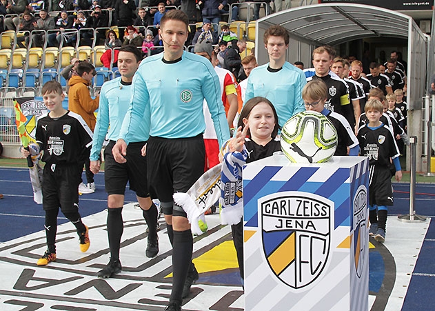 Jena. Zum Thüringen-Derby zwischen Jena und Erfurt laufen am Sonntag die Teams mit Fans beider Clubs ein.
