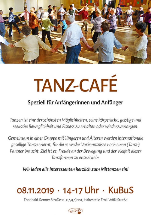 Geschrieben am 24. Juli 2017. Veröffentlicht in K2-Kategorie Veranstaltungen. Tanz-Café Speziell für Anfängerinnen und Anfänger - 08.11.2019 KuBuS jena weitere Infos..... Aufrufe: 499 Zurück Weiter