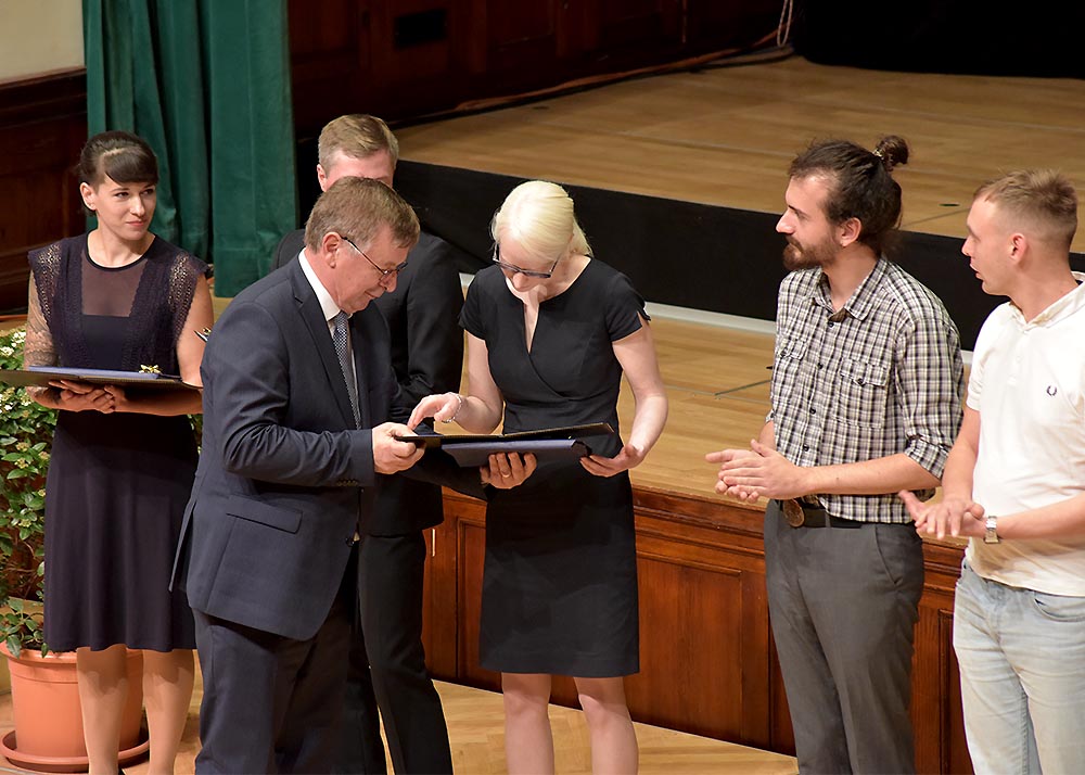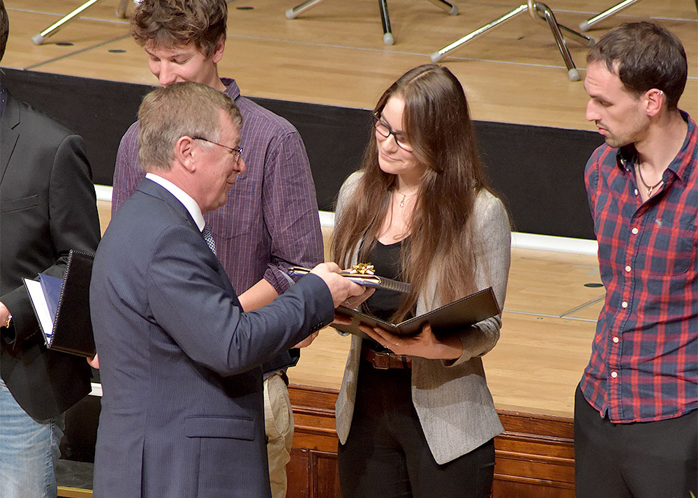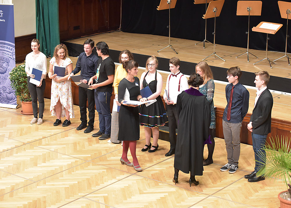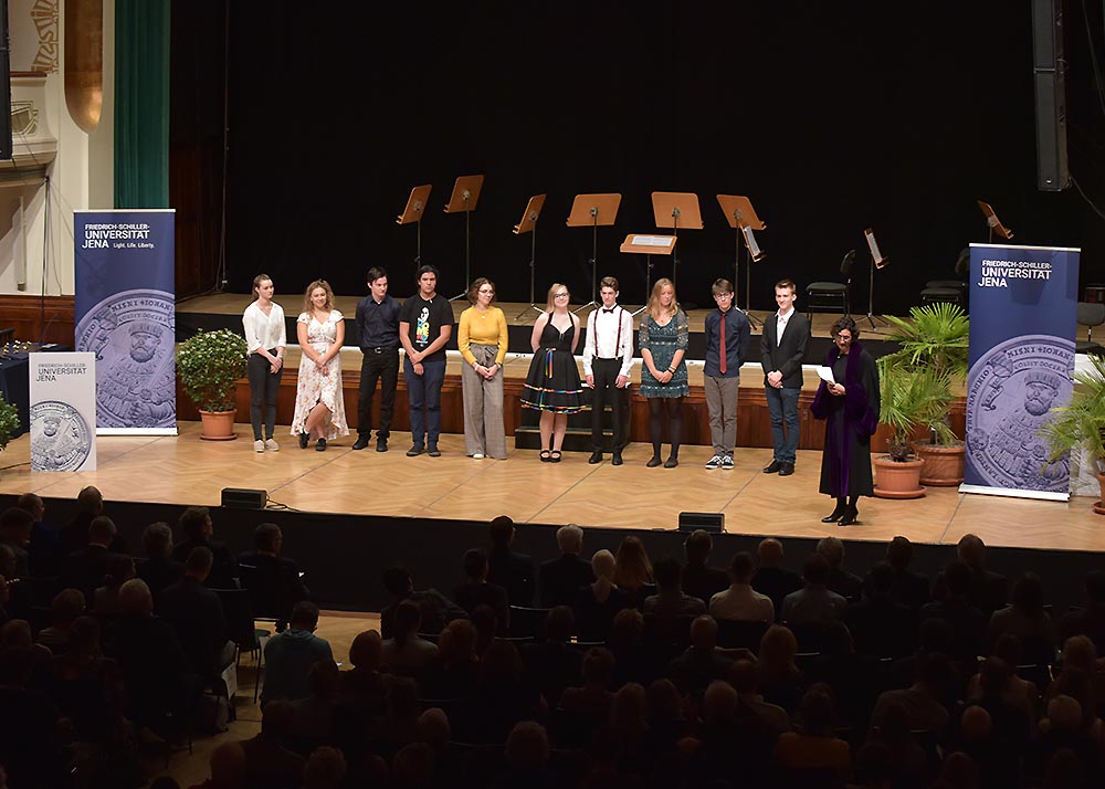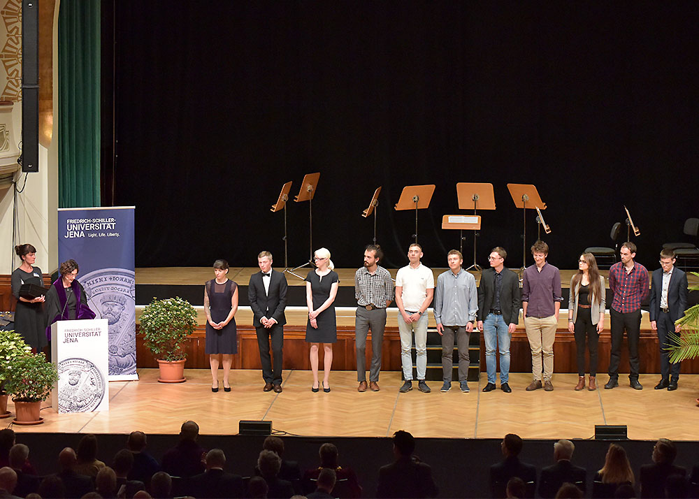 Nachfolgend überreichte die Universitätsleitung Preise an die besten Absolventinnen und Absolventen des vorangegangenen Studienjahres. Sie sind mit je 250 Euro dotiert und werden von der Gesellschaft der Freunde und Förderer der Friedrich-Schiller-Universität Jena gestiftet.