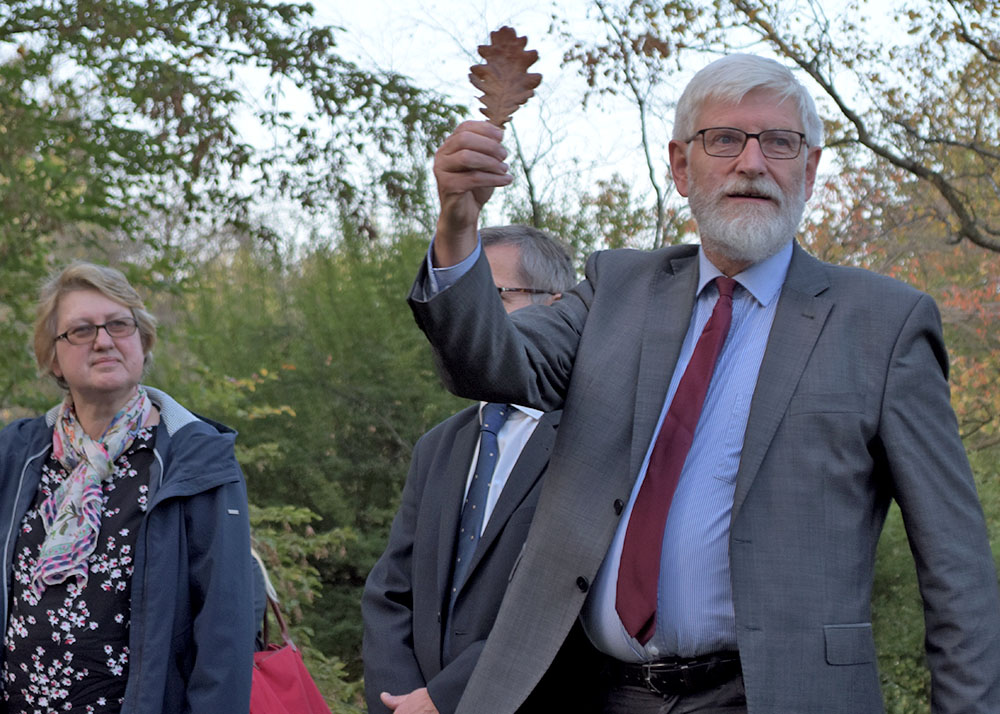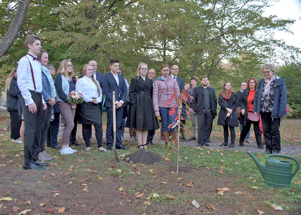 Gemeinsam mit Uni-Präsident Walter Rosenthal pflanzten die neuen Universitätsangehörigen im Anschluss eine nordamerikanische Roteiche im Botanischen Garten, die an die Matrikel 2019/20 erinnern wird. Die Universität Jena pflegt diese Tradition bereits seit 1993.