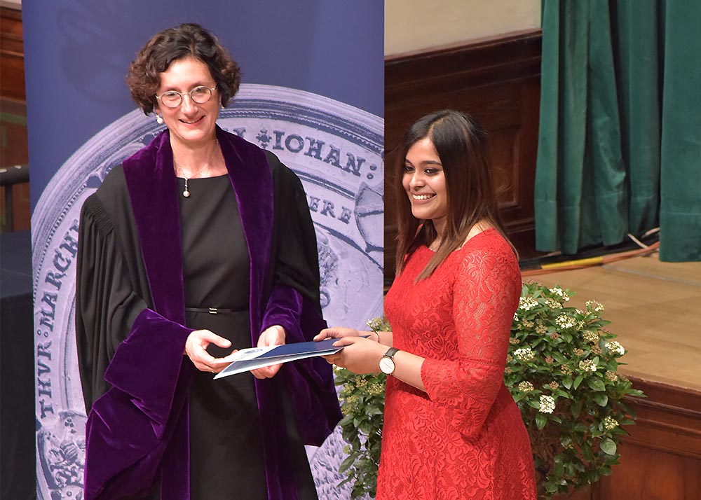 Eine weitere Auszeichnung wurde an die Bachelor-Studentin Aradhana Vijay überreicht. Die 23-jährige Inderin, die Germanistik und Interkulturelle Wirtschaftskommunikation studiert, erhielt den Preis des Deutschen Akademischen Austauschdienstes (DAAD) für ausländische Studierende. Sie überzeugte die Jury mit exzellenten Studienleistungen und besonderem gesellschaftlichen Engagement. Der Preis ist mit 1.000 Euro dotiert.