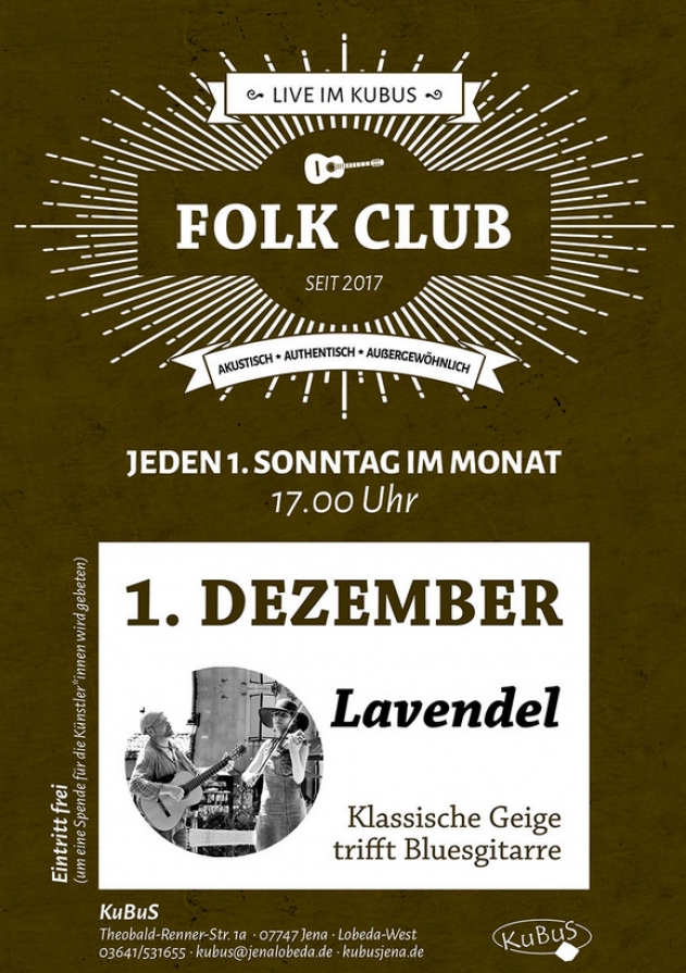 Geschrieben am 24. Juli 2017. Veröffentlicht in K2-Kategorie Veranstaltungen. Folk Club Diesmal zu Gast: Lavendel - 01.12.2019 KuBuS Jena weitere Infos..... Aufrufe: 295 Zurück Weiter