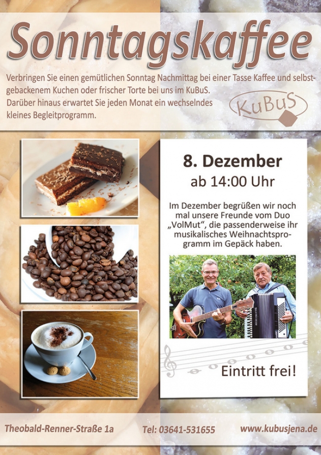 Geschrieben am 24. Juli 2017. Veröffentlicht in K2-Kategorie Veranstaltungen. Sonntagskaffee Musikalischer Gast: Duo „VolMut“ -08.12.2019 KuBuS Jena weitere Infos..... Aufrufe: 346 Zurück Weiter