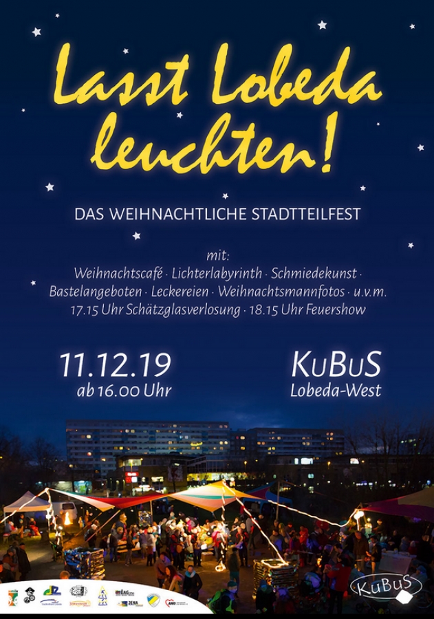 Geschrieben am 24. Juli 2017. Veröffentlicht in K2-Kategorie Veranstaltungen. Lasst Lobeda leuchten! Das weihnachtliche Stadtteilfest - 11.12.2019 KuBuS Jena weitere Infos..... Aufrufe: 348 Zurück Weiter