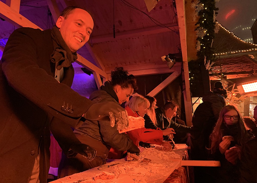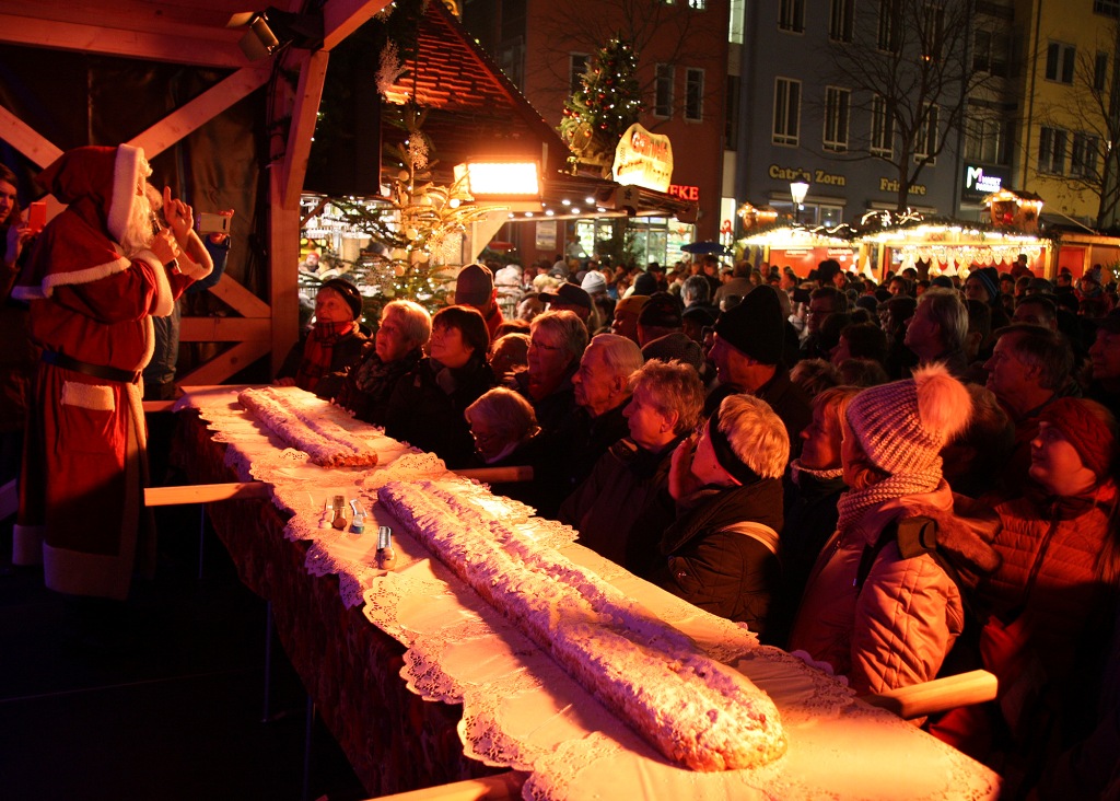Jena. Mit dem traditionellen Anschnitt des Riesenstollens wurde der Jenaer Weihnachtsmarkt von Bürgermeister Christian Gerlitz am frühen Montagabend offiziell eröffnet. Und wie immer war der Andrang auf eines der Stückchen riesig.