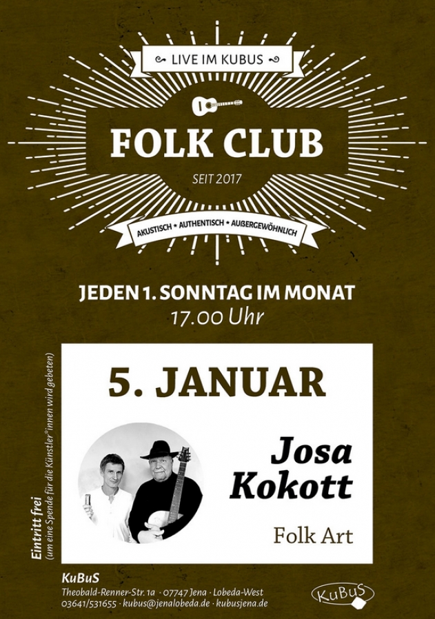 Geschrieben am 24. Juli 2017. Veröffentlicht in K2-Kategorie Veranstaltungen. Folk Club: Josa Kokott - 05.01.2020 KuBuS Jena weitere Infos..... Aufrufe: 371 Zurück Weiter