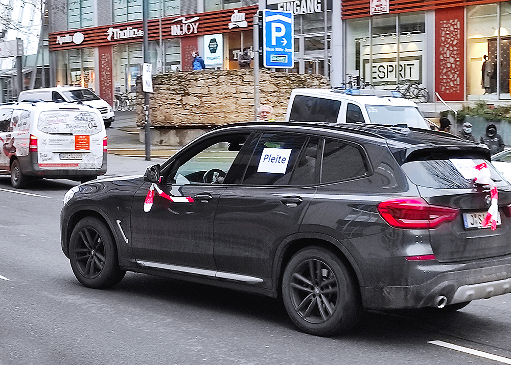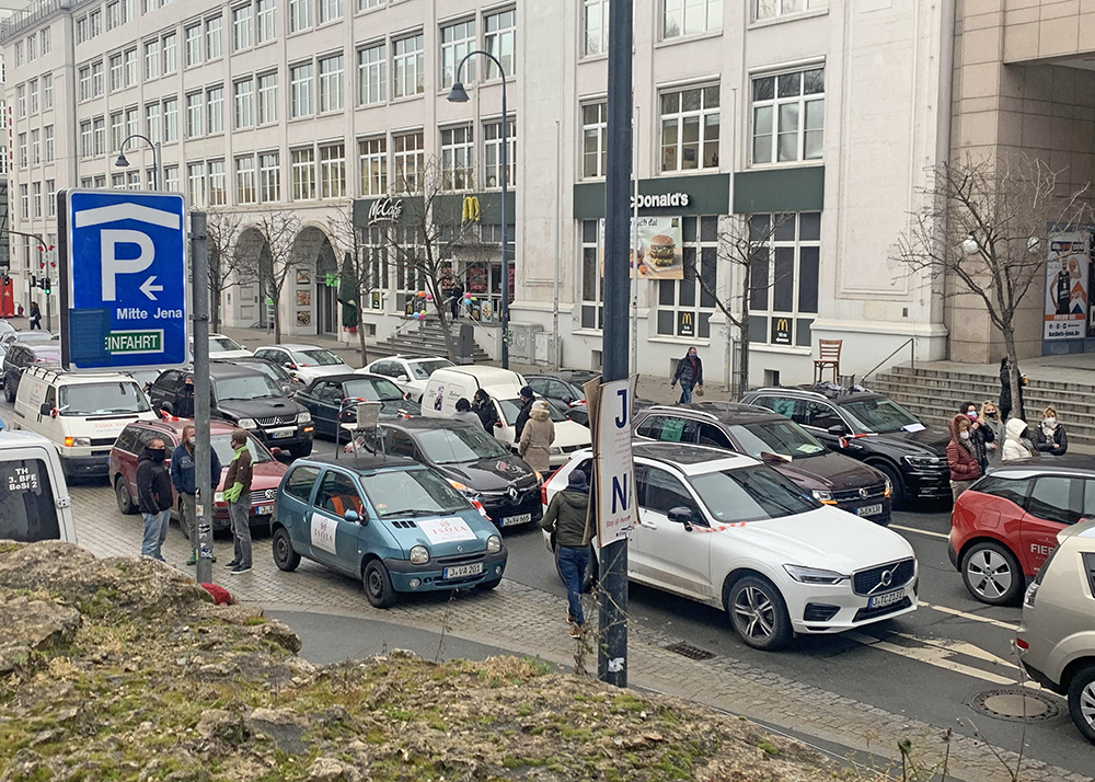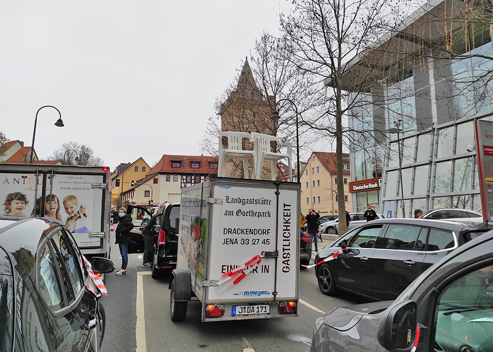 Jena. Mit 50 Autos setzten sich Vertreter von Gastronomie und Gewerbetreibenden heute Vormittag vom Stadion in Richtung Innenstadt in Bewegung, um auf ihre existenzbedrohende Lage aufmerksam zu machen.