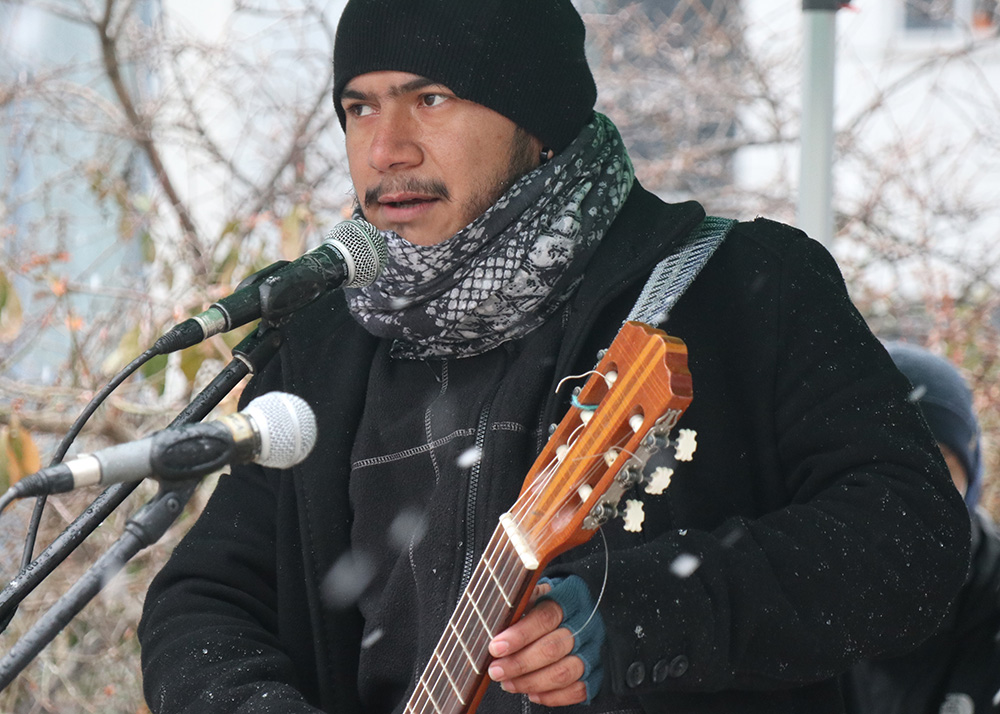 Der Musiker Roberto Sandino aus Nicaragua bat zu seinem ersten Lied die Demonstrant*innen darum, keinen Applaus zu spenden, denn er widmete es jenen, die sich in seiner Heimat gegen Umweltzerstörung einsetzen und dafür ihr Leben riskieren.