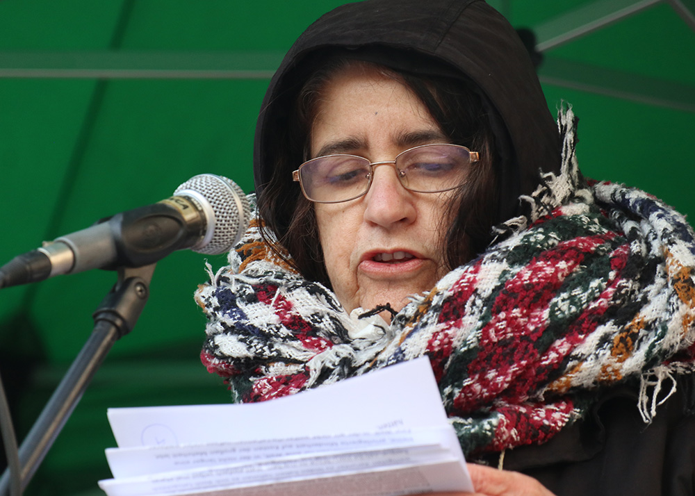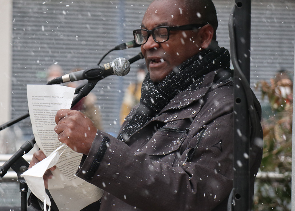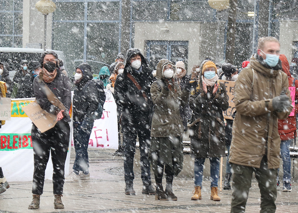 Trotz zeitweisem Schneetreibens hörten mehrere hundert Menschen über Stunden den Redebeiträgen aufmerksam zu, unter anderem von Prof. Daniel Egbe vom African Network for Solar Energy ANSOLE, der aufzeigte, dass koloniale Strukturen noch längst nicht überwunden sind und unser ganzes Denken durchdringen. Auch die Gruppe Klima & Klasse aus Jena brachte ihre Position, die Vernetzung von Klima- und sozialen Fragen, ein.