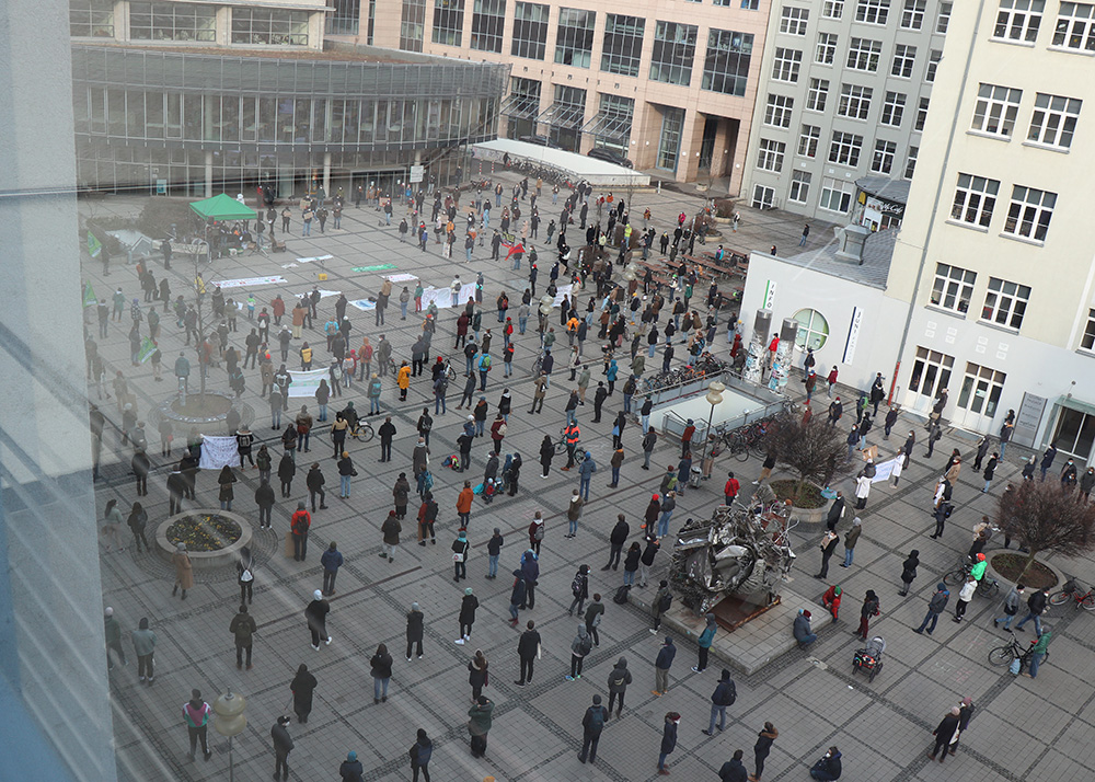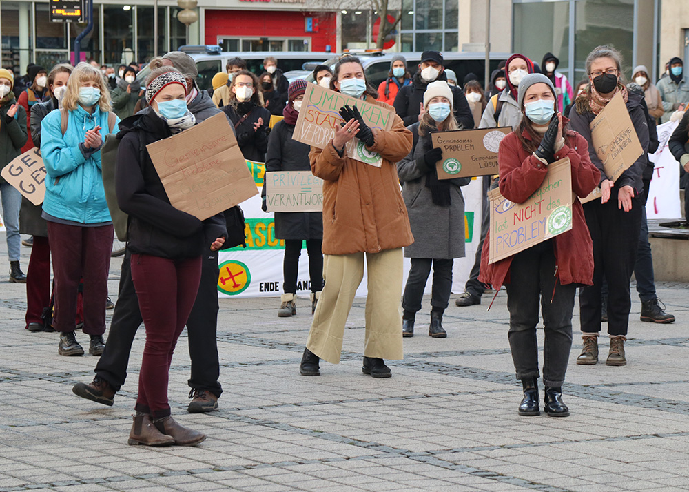Deutlich leiser als sonst verlief die Kundgebung nicht wegen der Masken, sondern der bedrückenden Themen: Flucht, systematische Ausgrenzung und – wie zuletzt in Indien bei einer Aktivistin von Fridays for Future – staatlicher Repressalien gegen Menschen, die sich für den Erhalt unser aller Lebensgrundlagen einsetzen.