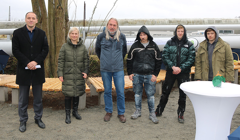 Einweihung der Bogenbank mit Bürgermeister Christian Gerlitz, Stadtwerke-Geschäftsführerin Claudia Budich, Michael Strosche von der ÜAG sowie drei Auszubildenden, die das Projekt handwerklich umsetzen. Foto: Stadtwerke Jena