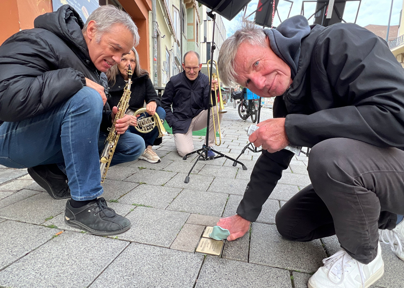 Till Noack (r.) putzte mit musikalischer Unterstützung durch Klaus Wegener (l.), Uta und Gerhard Paulus die Jenaer Stolpersteine.