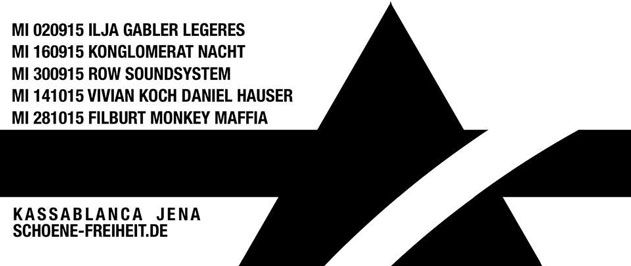 Geschrieben am 28. September 2015. Veröffentlicht in K2-Kategorie Veranstaltungen. Schöne Freiheit - Row Soundsystem - 30. September 2015 Kassablanca Jena weitere Infos ... Aufrufe: 571 Zurück Weiter