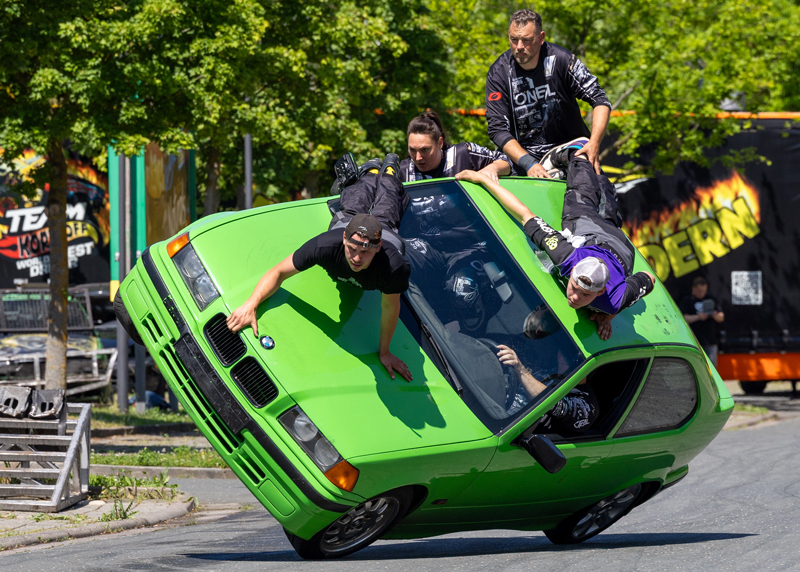 Für Nervenkitzel sorgte schließlich der Kamikazesturzflug: Aus 35 Metern Höhe stürzte ein bemannter Pkw auf aufgestapelte Autos – ein Moment, der den Atem der Zuschauer stocken ließ.