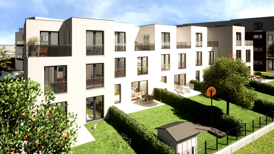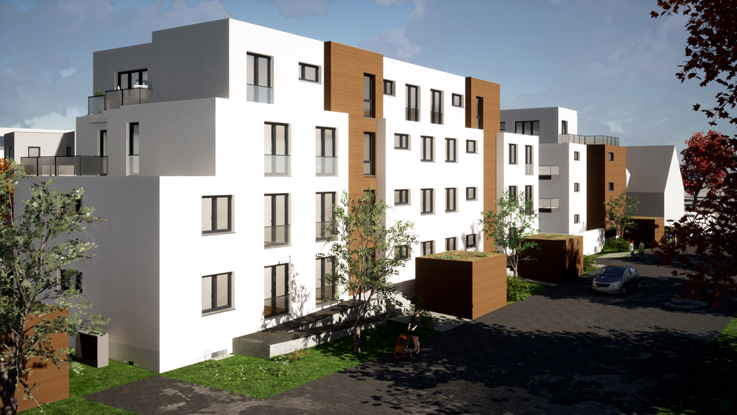 Insgesamt werden dort 63 Wohneinheiten errichtet, verteilt auf drei Mehrfamilienhäuser und eine Reihenhausanlage.