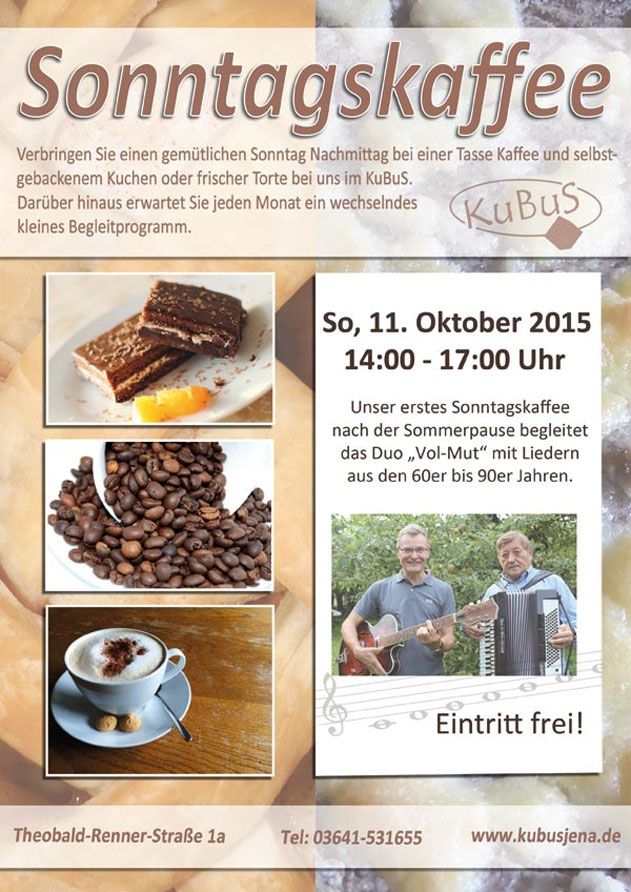 Geschrieben am 28. September 2015. Veröffentlicht in K2-Kategorie Veranstaltungen. Sonntagskaffee mit dem Duo „Vol-Mut“ - 11. Oktober 2015 im KuBuS Jena weitere Infos ... Aufrufe: 525 Zurück Weiter