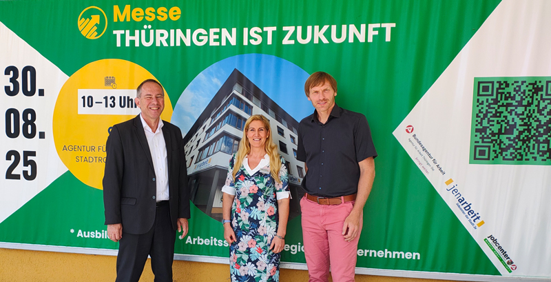 v.l.n.r.: Stefan Scholz (Chef der Agentur für Arbeit Thüringen Ost), Dr. Diana Karadzhova-Beyer (Geschäftsführerin des Jobcenters Saale-Holzland-Kreis) und Matthias Welsch (Werkleiter jenarbeit). Foto: Agentur für Arbeit