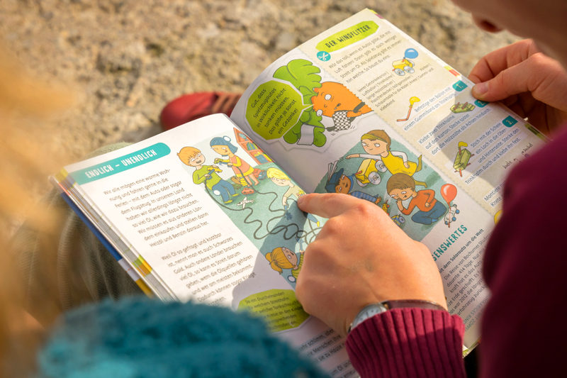 Neben ausreichend Platz für die Hausaufgaben finden die Kinder zahlreiche Tipps zum Stromsparen, Informationen über den Unterschied zwischen Wetter und Klima sowie praktische Anregungen für einen klimaschonenden Schulweg.