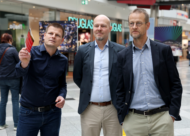 Bei einem Rundgang stellt Fotograf Tino Zippel dem Centermanager Michael Holz und Volker Gühne von der Hospiz- und Palliativ-Stiftung die neuen Motive vor.