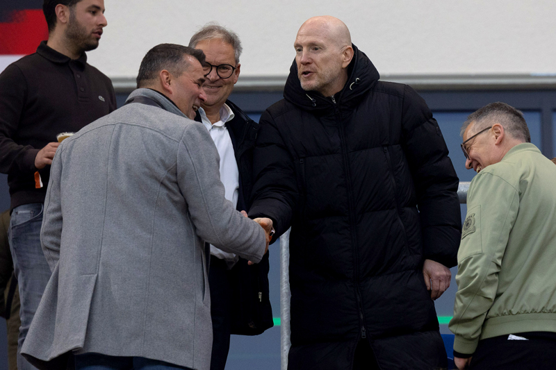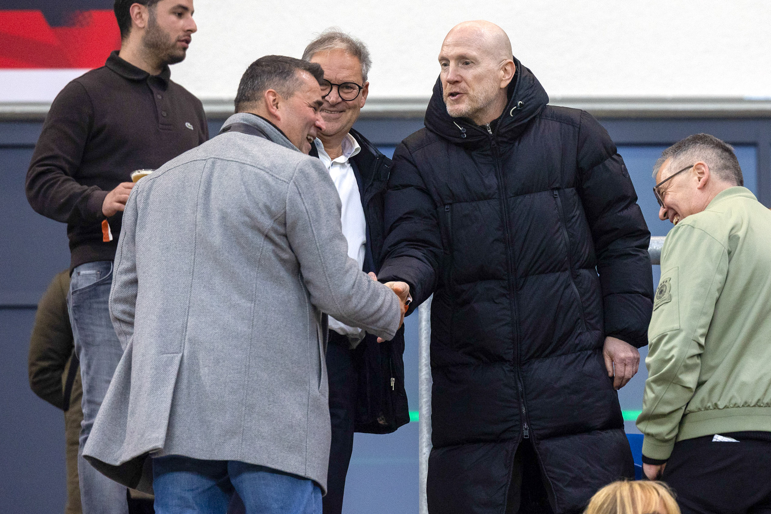 Matthias Sammer vom DFB (m.) wurde auf der Tribüne von Elf5-Chef Lars Eberlein (l.) begrüßt.
