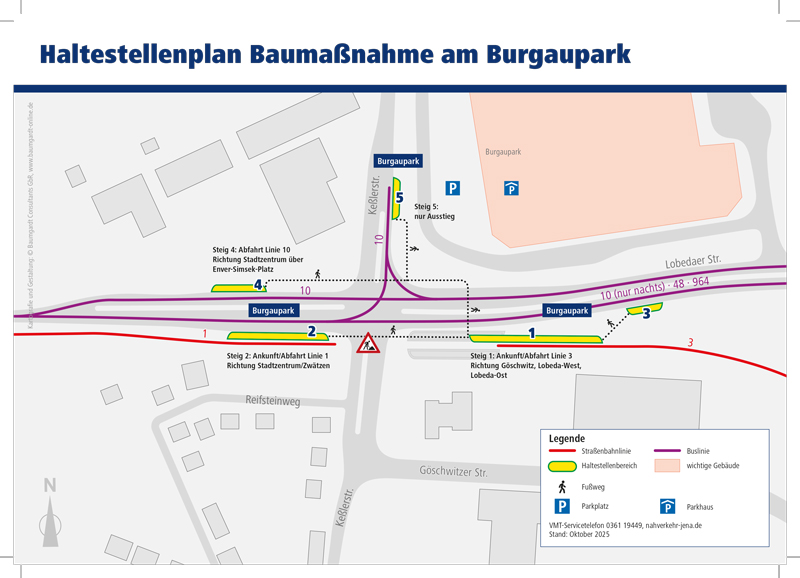 Alle Informationen zum Verkehrsangebot während dieser Baumaßnahme sowie die aktualisierten Fahrplantabellen finden sich unter www.stadtwerke-jena.de/gleisbau-burgau.