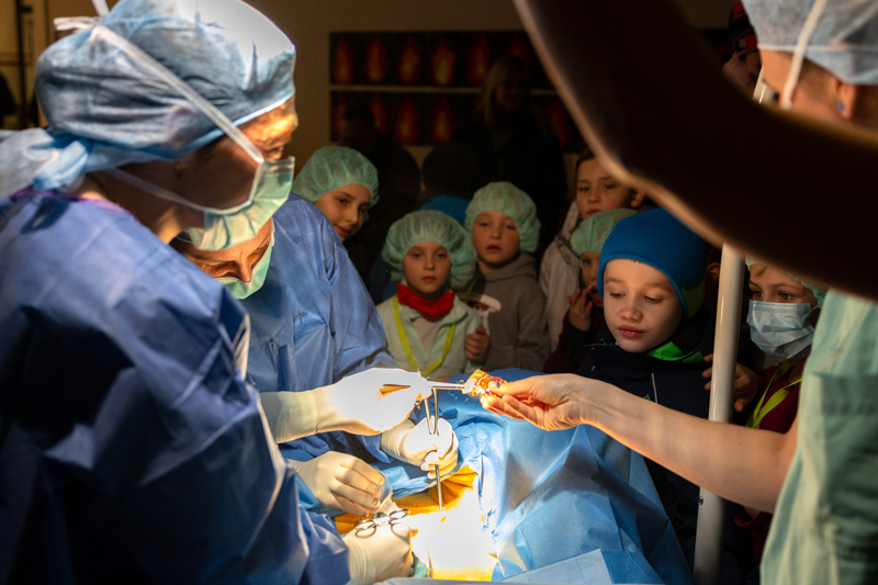Der Teddy „Karl“ hatte Gummibärchen samt Tüte verschluckt und musste daher vor den zahlreichen Kinderaugen von zwei Ärztinnen sowie zwei OP-Schwestern des Universitätsklinikums notoperiert werden.