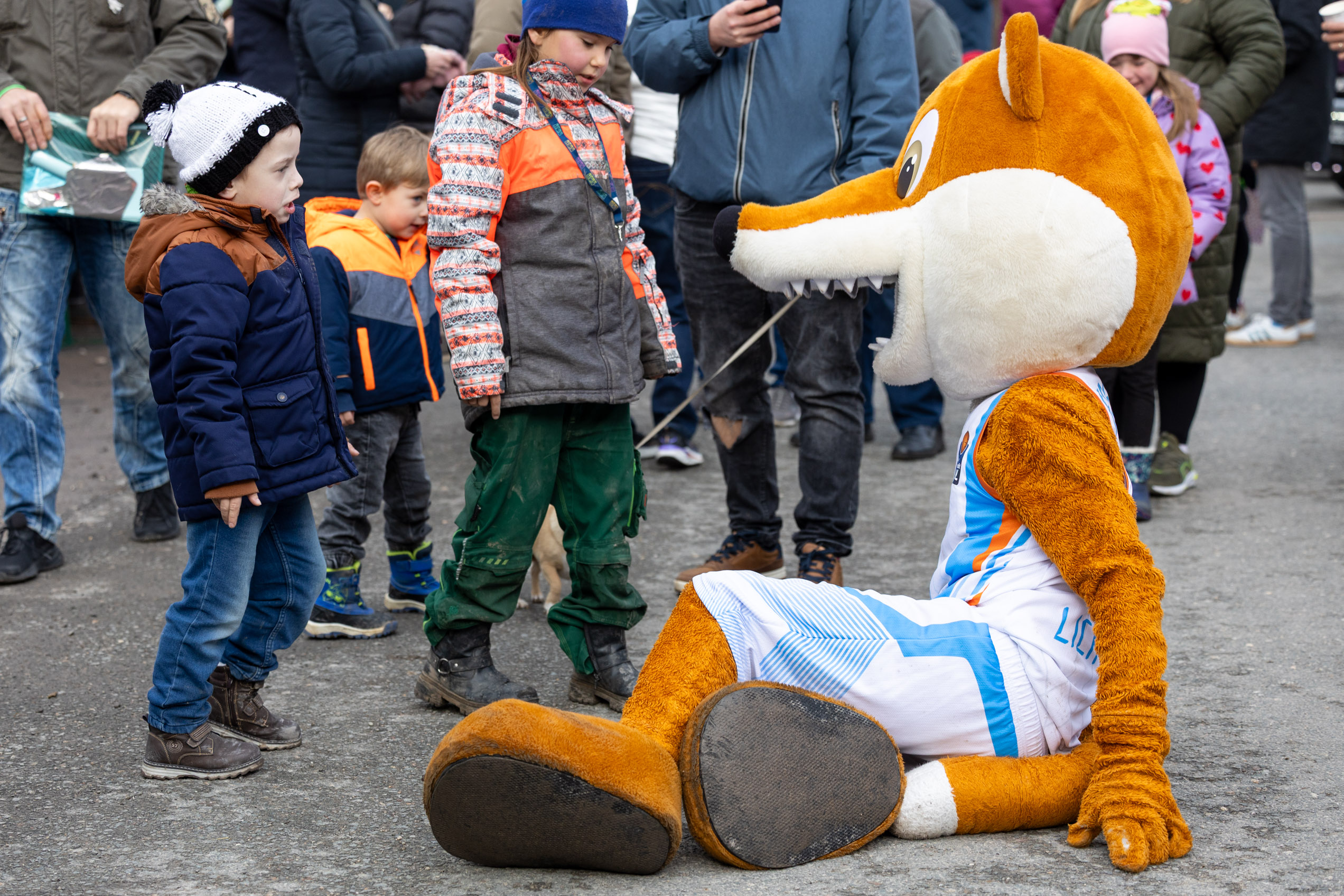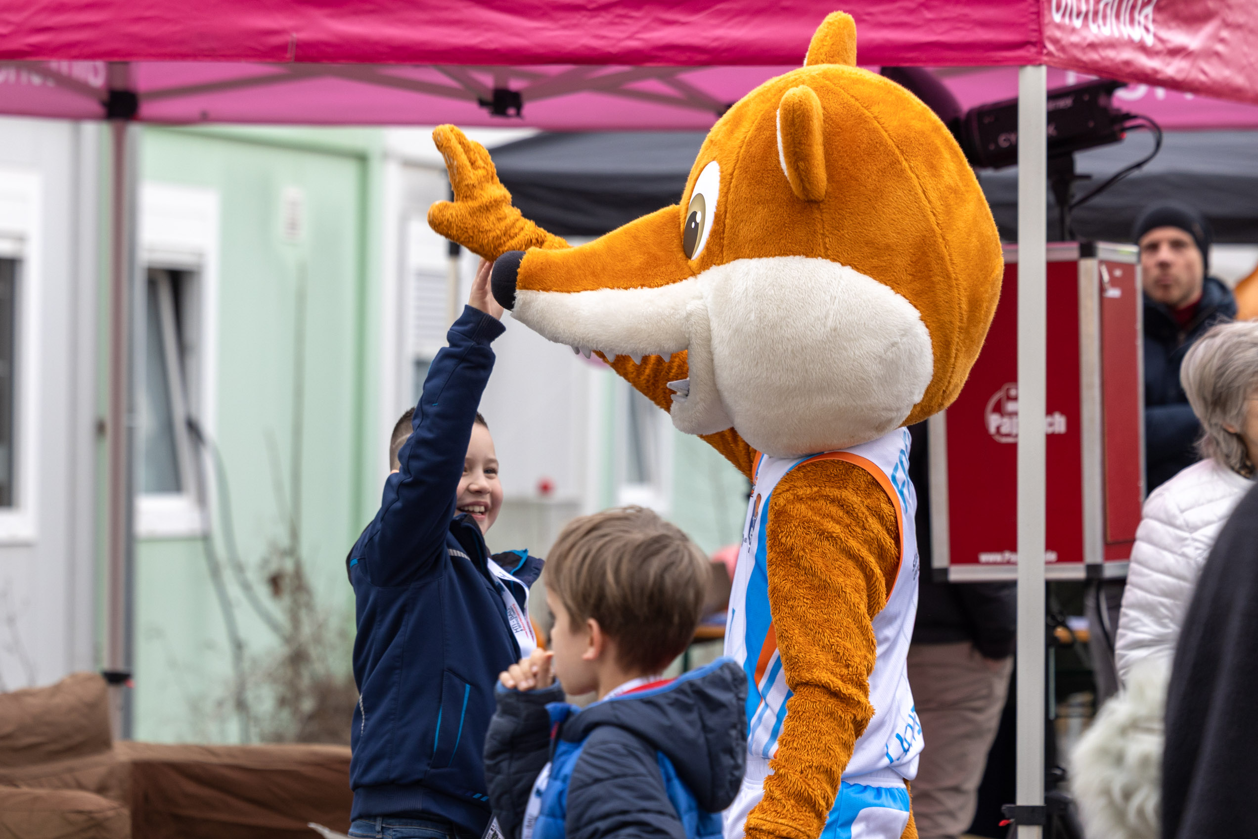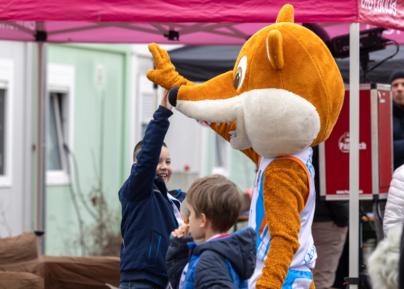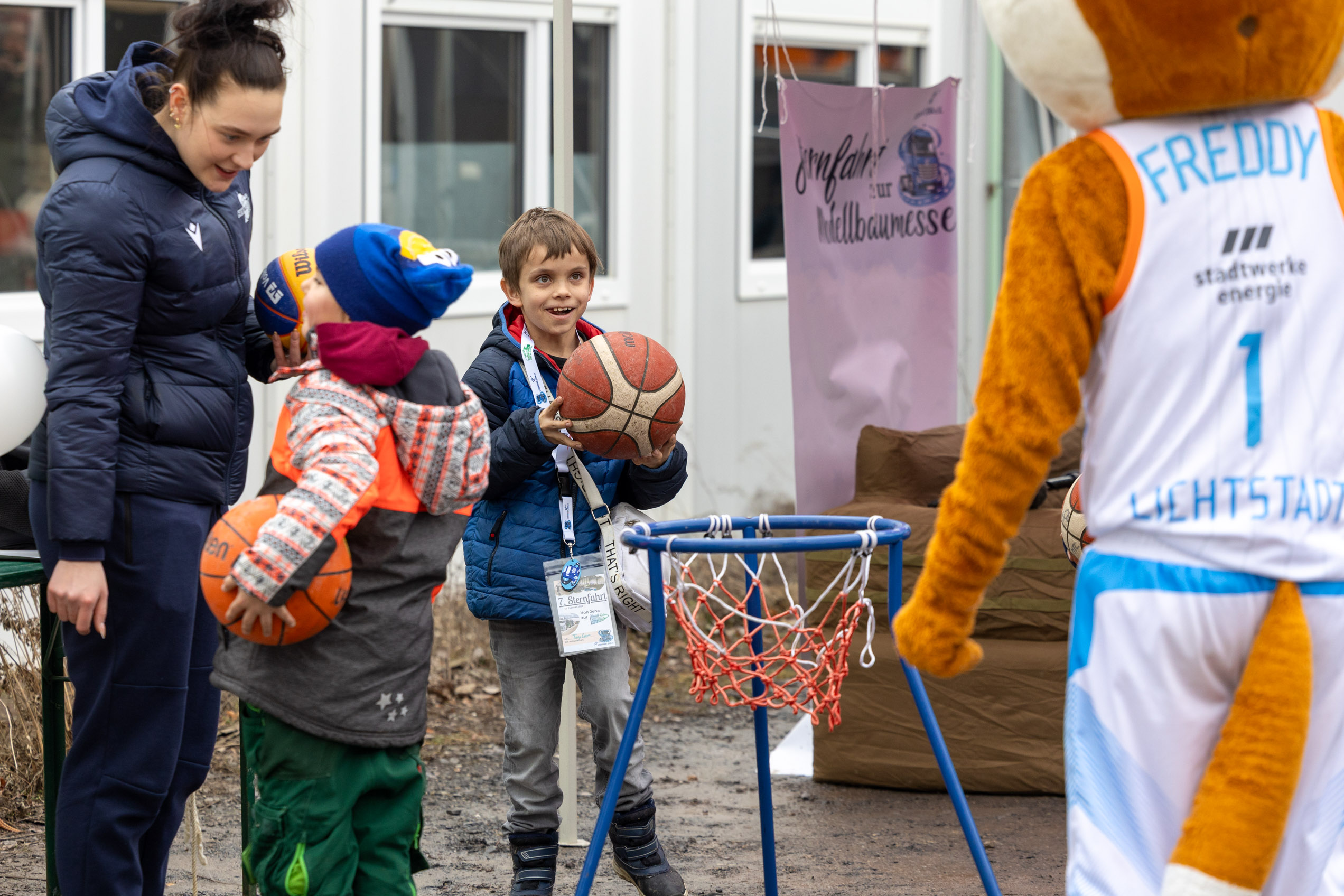 Freude mit „Freddy“, dem Maskottchen des Basketball-Erstligisten Science City Jena.