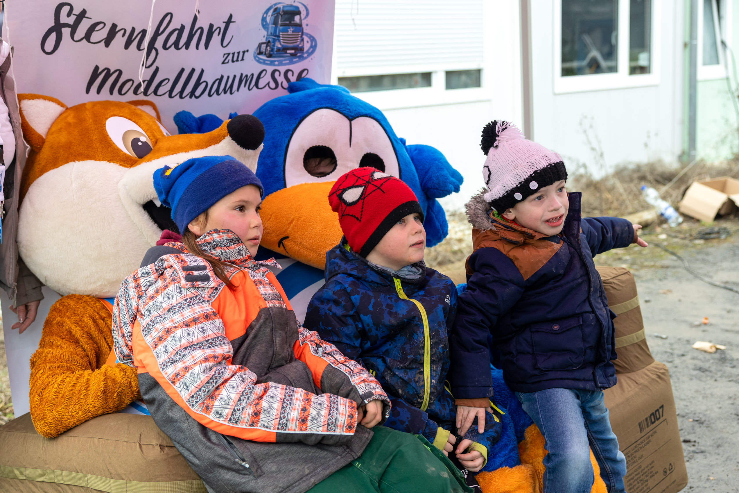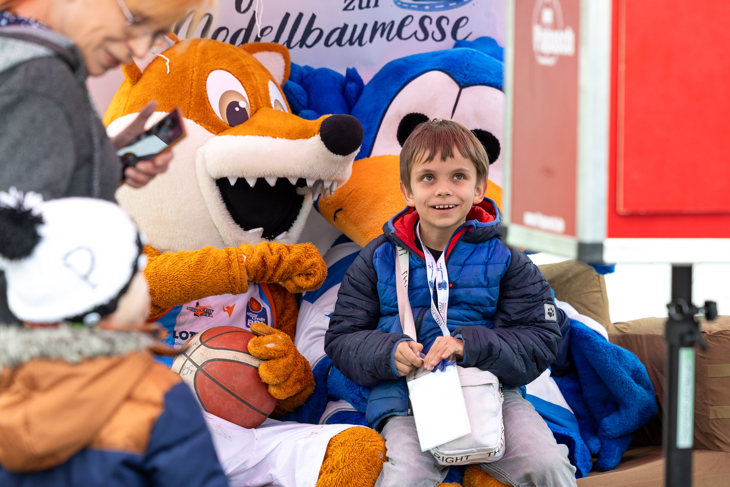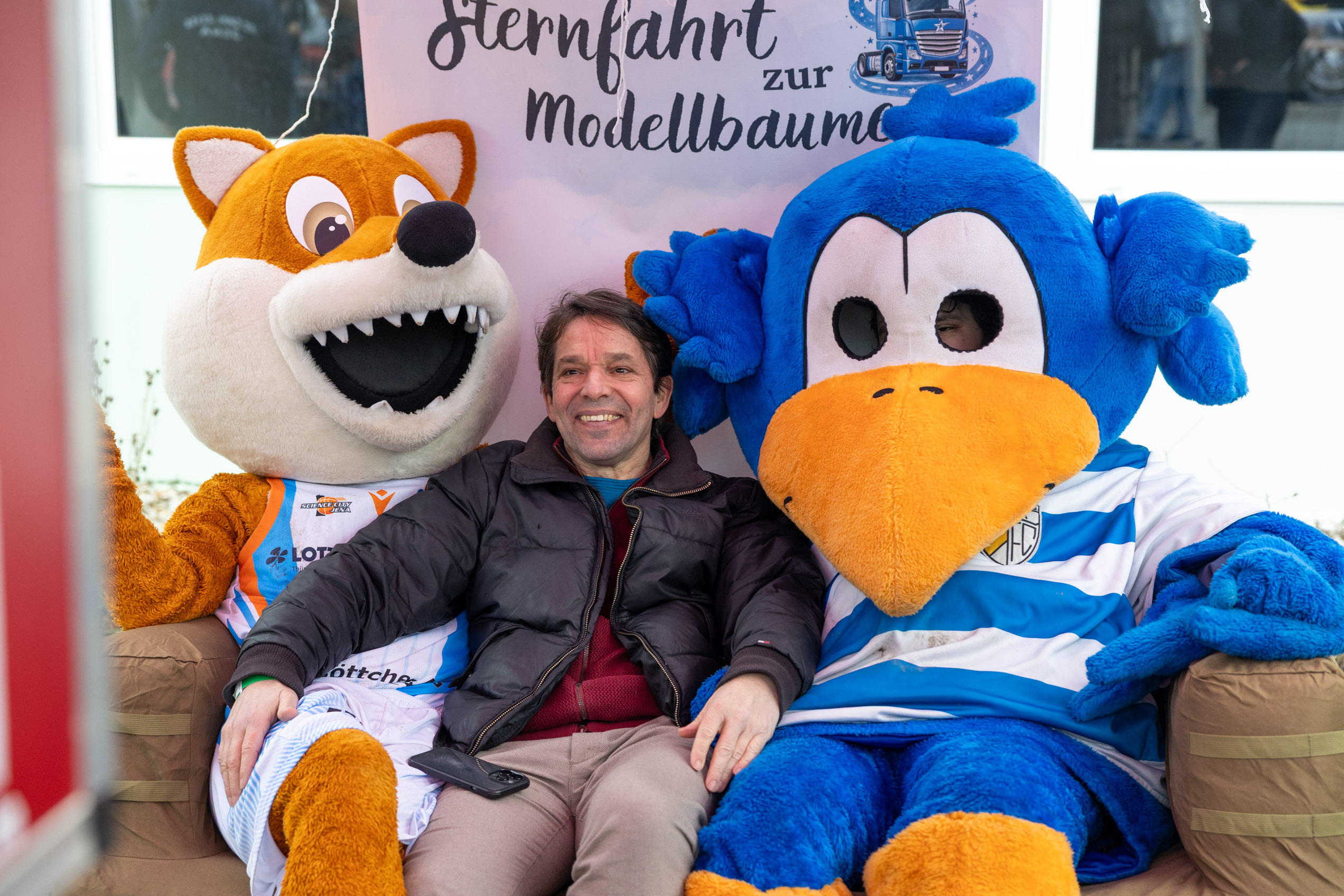 Bevor die Motoren aufheulten, wurden die Familien herzlich begrüßt. Die Maskottchen von Science City Jena und FC Carl Zeiss Jena sorgten für gute Laune.
