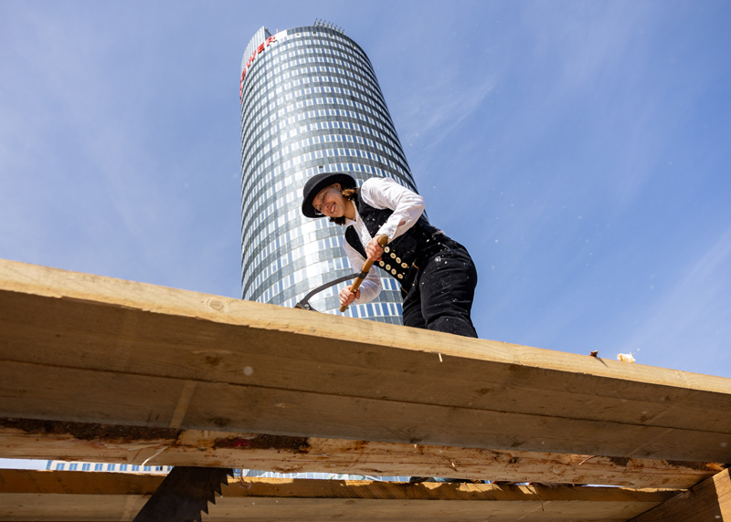 Der 19-jährige Dennis Trzepalkowski, Auszubildender im ersten Lehrjahr zum Zimmerer, zeigte seine ersten Fertigkeiten.