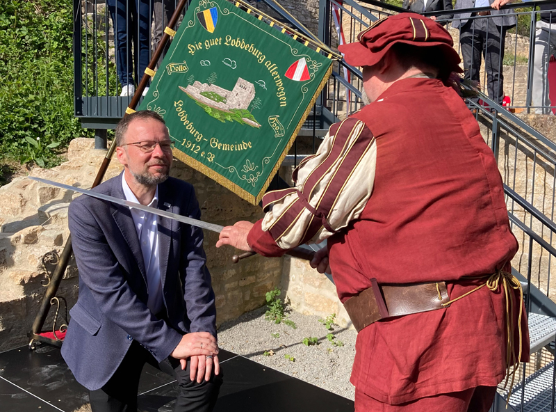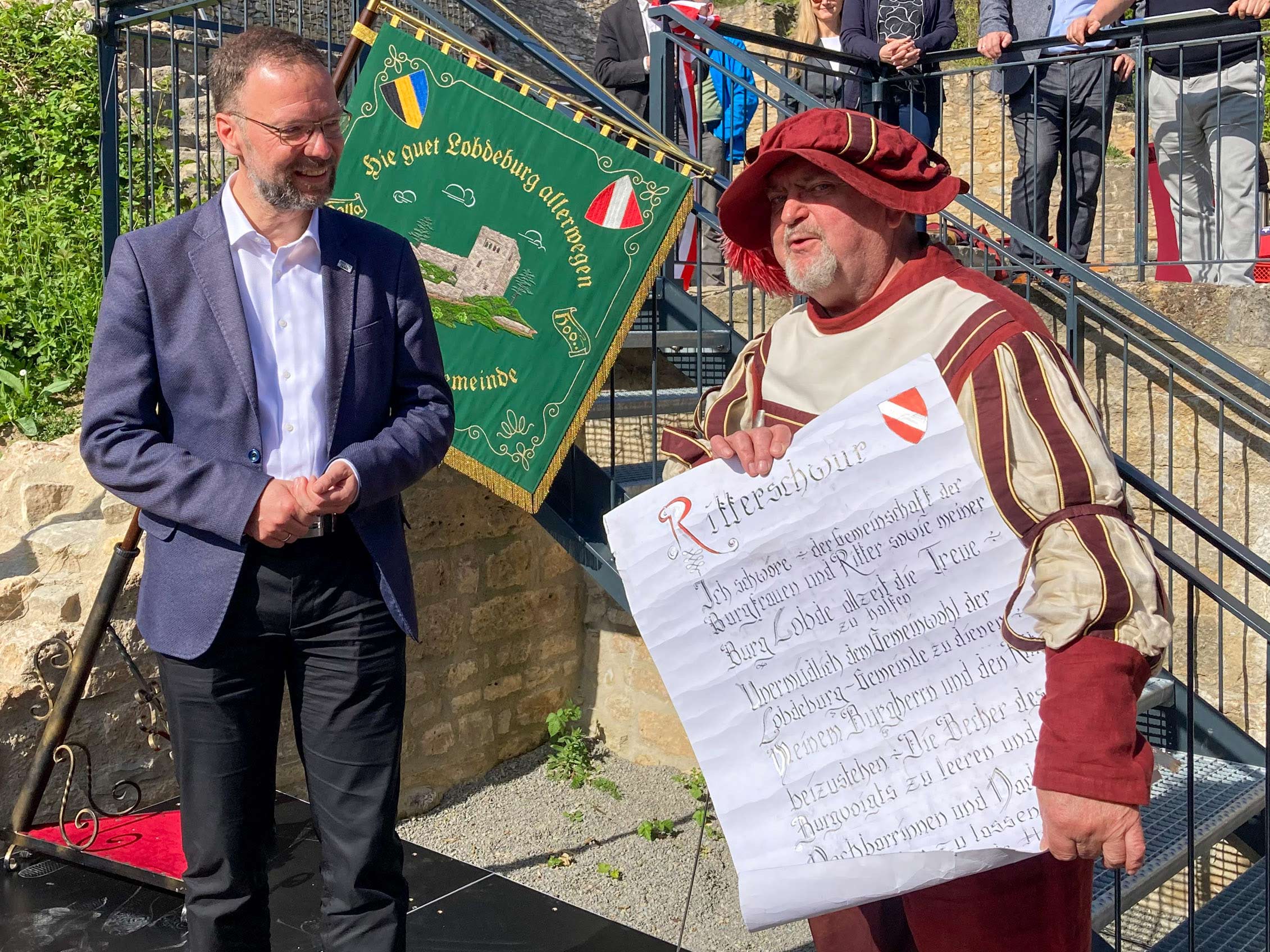 Jenas Oberbürgermeister Thomas Nitzsche wurde von Hans‑Jürgen Domin vom Verein Lobdeburg‑Gemeinde zum Ritter geschlagen.