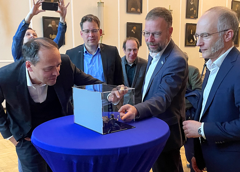 Freuen sich über den Mini‑Abbe: v.l.n.r. Christian Gerlitz (Geschäftsführer der Ernst-Abbe-Stiftung), Felix Streiter (Geschäftsführer der Carl-Zeiss-Stiftung), OB Thomas Nitzsche (FDP) und Timo Mappes (Gründungsdirektor des D.O.M.). Foto: Anton Kull