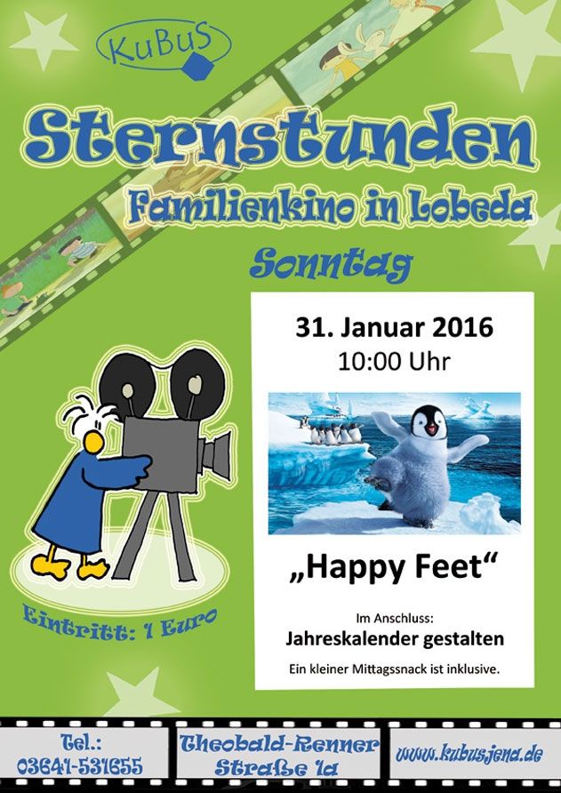 Geschrieben am 29. Januar 2016. Veröffentlicht in K2-Kategorie Veranstaltungen. Sternstunden Familienkino Film: „Happy Feet“ (USA, 2006) - 31. Januar 2016 KuBuS Jena weitere Infos ... Aufrufe: 260 Zurück Weiter