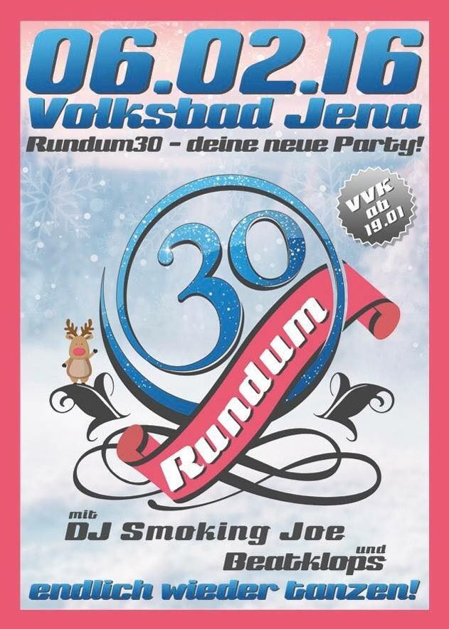 Geschrieben am 29. Januar 2016. Veröffentlicht in K2-Kategorie Veranstaltungen. Rundum 30-Party - 06. Februar 2016 Volksbad Jena weiter Infos ... Aufrufe: 245 Zurück Weiter