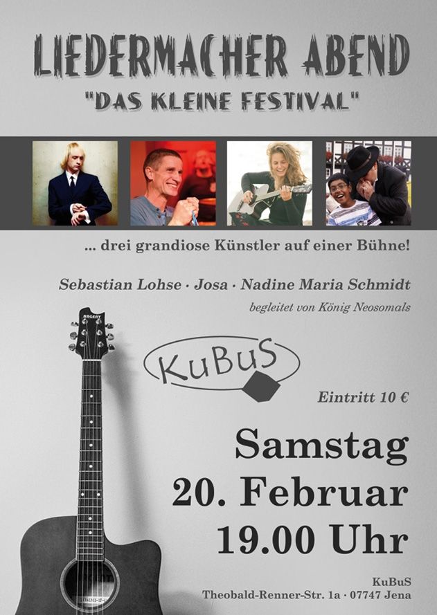 Geschrieben am 29. Januar 2016. Veröffentlicht in K2-Kategorie Veranstaltungen. Liedermacher Abend „Das kleine Festival“ - 20. Februar 2016 KuBuS Jena weitere Infos ... Aufrufe: 237 Zurück Weiter