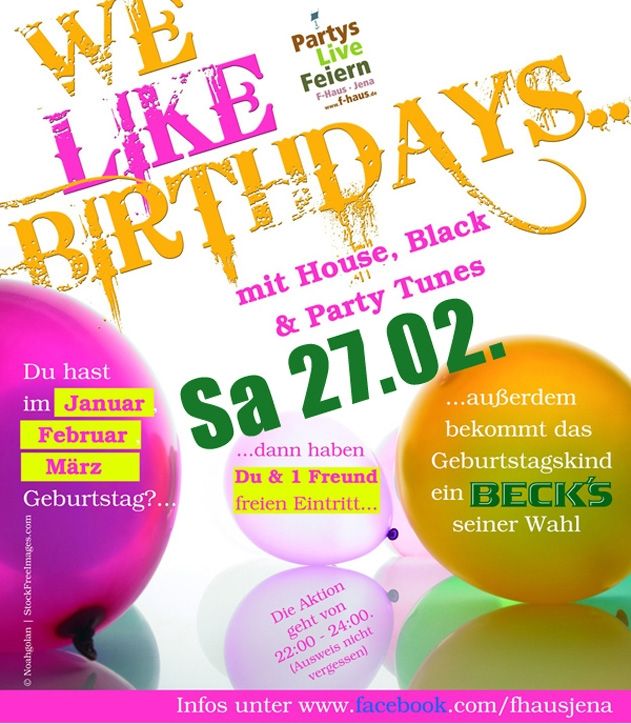 Geschrieben am 29. Januar 2016. Veröffentlicht in K2-Kategorie Veranstaltungen. We Like Birthdays - 27. Februar 2016 F-Haus Jena weitere Infos ... Aufrufe: 208 Zurück Weiter