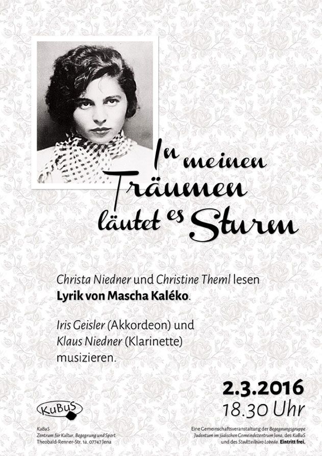 Geschrieben am 29. Januar 2016. Veröffentlicht in K2-Kategorie Veranstaltungen. Ein Abend mit Lyrik von Mascha Kaléko „In meinen Träumen läutet es Sturm“ - 02. März 2016 KuBuS Jena weitere Infos ... Aufrufe: 290 Zurück Weiter
