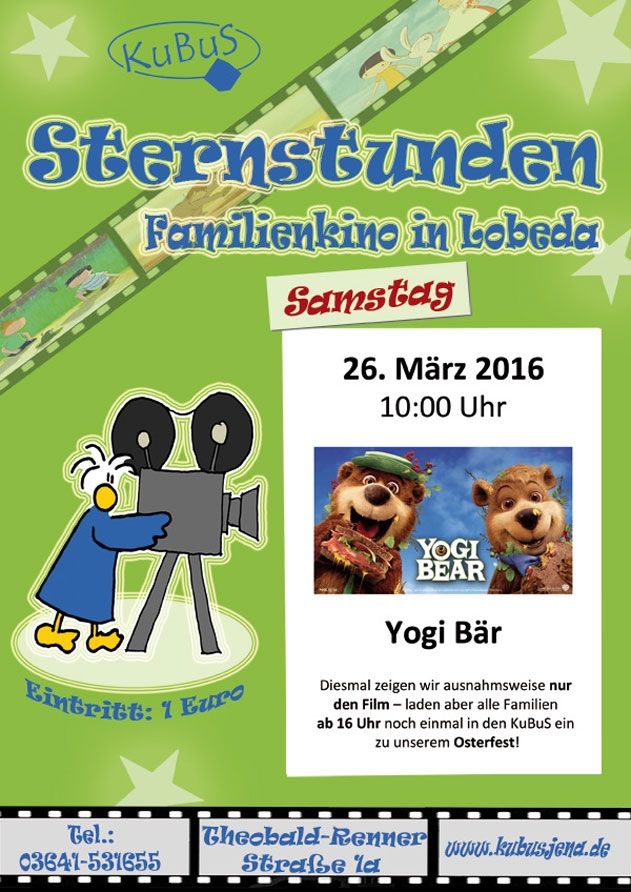 Geschrieben am 29. Januar 2016. Veröffentlicht in K2-Kategorie Veranstaltungen. Sternstunden Familienkino Film: „Yogi Bär“ (USA, 2010) - 26. März 2016 KuBuS Jena weitere Infos ... Aufrufe: 277 Zurück Weiter
