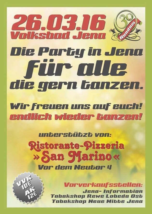 Geschrieben am 29. Januar 2016. Veröffentlicht in K2-Kategorie Veranstaltungen. Rundum30-Party - 26. März 2016 Volksbad Jena weitere Infos ... Aufrufe: 295 Zurück Weiter
