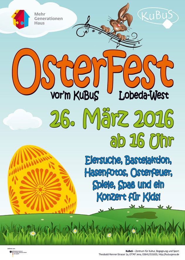 Geschrieben am 29. Januar 2016. Veröffentlicht in K2-Kategorie Veranstaltungen. Osterfest - 26. März 2016 vor'm KuBuS Lobeda-West weitere Infos ... Aufrufe: 330 Zurück Weiter