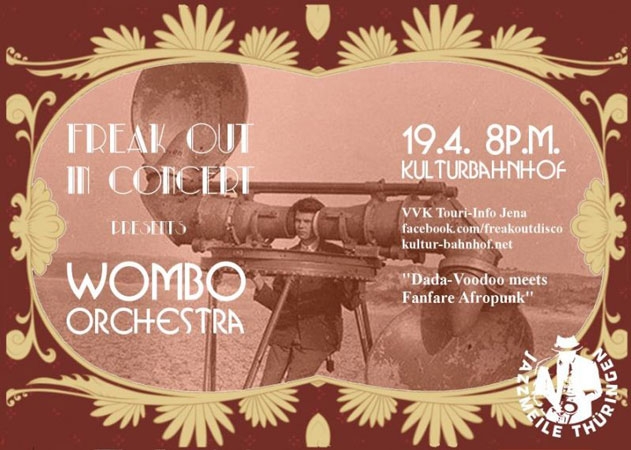 Geschrieben am 29. Januar 2016. Veröffentlicht in K2-Kategorie Veranstaltungen. Wombo Orchestra - 19. Aril 2016 Kultuarbahnhof Jena weitere Infos ... Aufrufe: 415 Zurück Weiter