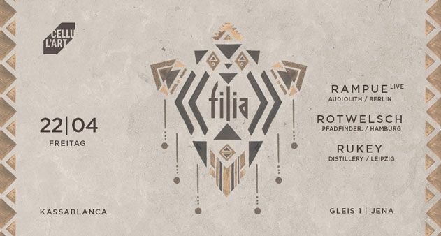 Geschrieben am 29. Januar 2016. Veröffentlicht in K2-Kategorie Veranstaltungen. FILIA! LIVE: Rampue | DJ's: Rotwelsch | Rukey - 22. April 2016 Kassablanca Jena weitere Infos ... Aufrufe: 283 Zurück Weiter