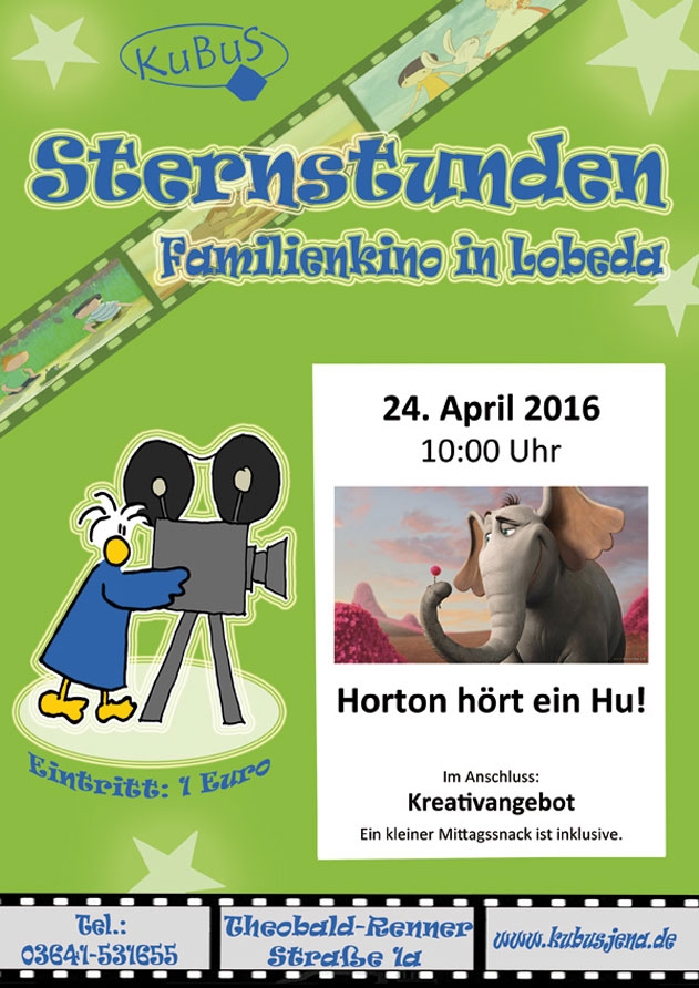 Geschrieben am 29. Januar 2016. Veröffentlicht in K2-Kategorie Veranstaltungen. Sternstunden Familienkino Film: „Horton hört ein Hu!“ (USA, 2008) - 24. April 2016 KuBuS Jena weitere Infos ... Aufrufe: 366 Zurück Weiter