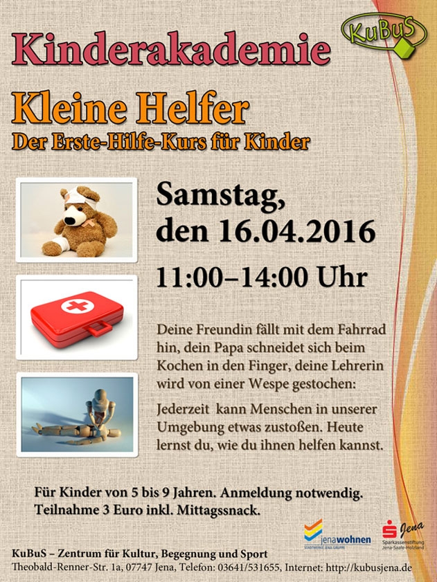 Geschrieben am 29. Januar 2016. Veröffentlicht in K2-Kategorie Veranstaltungen. Kinderakademie Thema: „Kleine Helfer: Der Erste-Hilfe-Kurs für Kinder“ - 16. April 2016 KuBuS Jena weitere Infos ... Aufrufe: 452 Zurück Weiter
