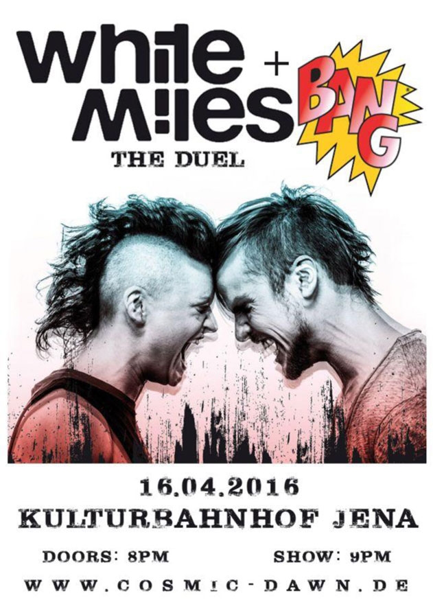Geschrieben am 29. Januar 2016. Veröffentlicht in K2-Kategorie Veranstaltungen. BANG + White Miles - 16. April 2016 Kulturbahnhof Jena weitere Infos ... Aufrufe: 692 Zurück Weiter