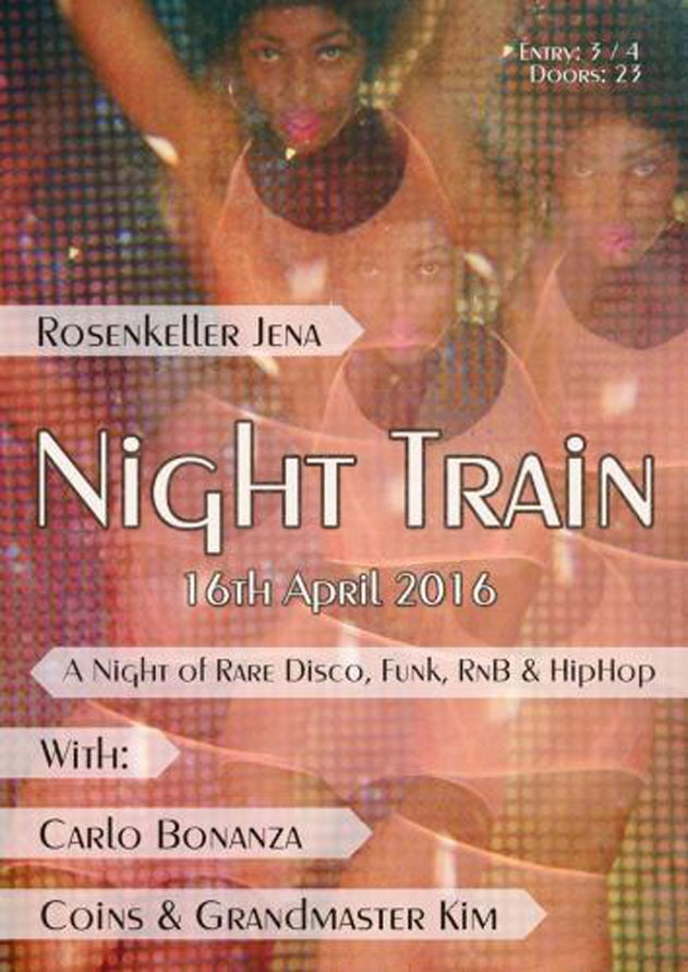 Geschrieben am 29. Januar 2016. Veröffentlicht in K2-Kategorie Veranstaltungen. NIGHT TRAIN with: CARLO BANANZA + COINS + GRANDMASTER KIM - 16. April Rosenkeller Jena weitere Infos ... Aufrufe: 379 Zurück Weiter