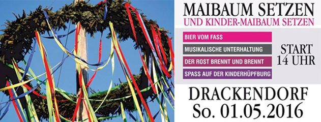 Geschrieben am 29. Januar 2016. Veröffentlicht in K2-Kategorie Veranstaltungen. Maibaumsetzen in Drackendorf - am 01. Mai 2016 ab 14 Uhr mit DJ MARIO weitere Infos ... Aufrufe: 482 Zurück Weiter