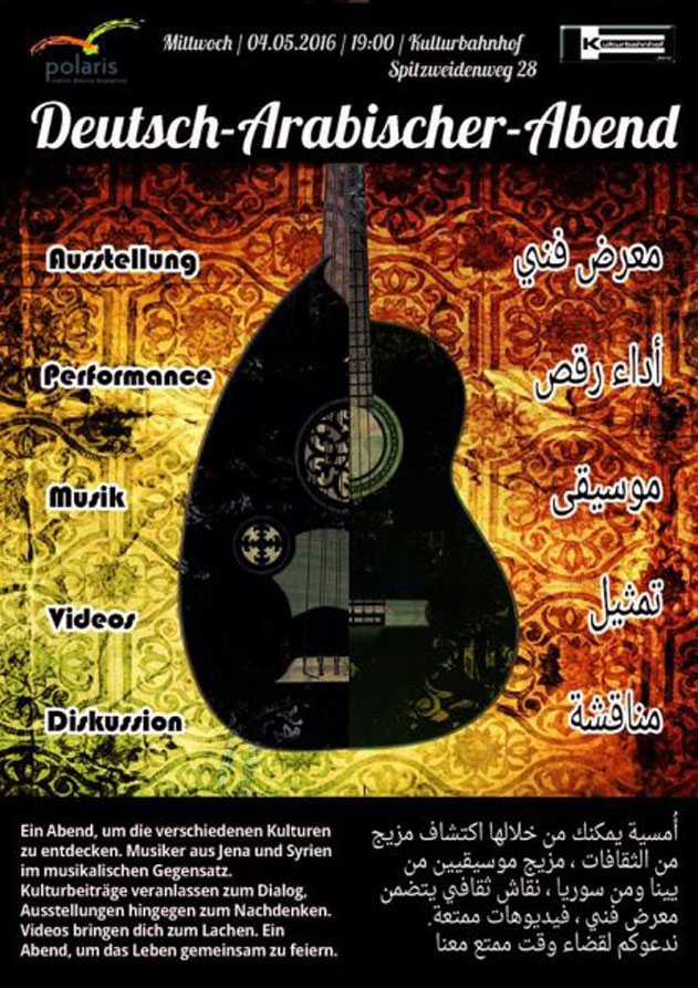 Geschrieben am 29. Januar 2016. Veröffentlicht in K2-Kategorie Veranstaltungen. Deutsch - Arabischer Abend - 04. Mai 2016 Kulturbahnhof Jena weitere Infos ... Aufrufe: 361 Zurück Weiter