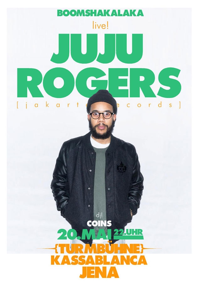 Geschrieben am 29. Januar 2016. Veröffentlicht in K2-Kategorie Veranstaltungen. Boomshakalaka LIVE: Juju Rogers | DJ: Coins - 20. Mai 2016 Kassablanca Jena weitere Infos ... Aufrufe: 344 Zurück Weiter