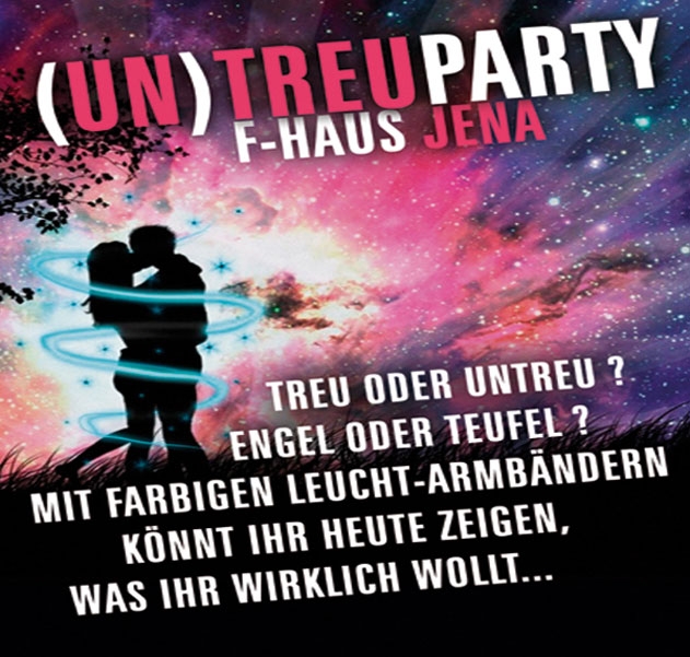 Geschrieben am 29. Januar 2016. Veröffentlicht in K2-Kategorie Veranstaltungen. (UN)TREUPARTY - 28. Mai 2016 F-Haus Jena weitere Infos ... Aufrufe: 280 Zurück Weiter