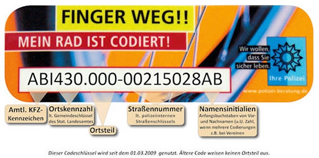 Jena. Bei der Fahrradcodierung wird in das Rahmenrohr unter dem Sattel ein 14-stelliger Code ein gefräst, der aus Buchstaben und Zahlen besteht. Der eingefräste Code wird mit einem speziellen Aufkleber mit Sichtfenster abgedeckt, der bundesweit einheitlich durch die Polizei verwendet wird. Somit ist für jedermann erkennbar, dass das Fahrrad codiert und polizeilich registriert ist.
